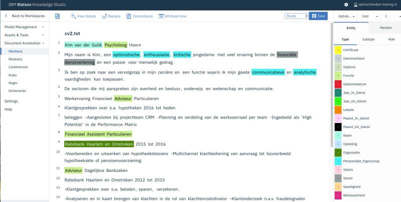 Je gaat een model trainen dat HR specifieke termen, concepten en relaties kan herkennen in data. Dat doe je door het systeem data te voeden, aan te geven wat je het wilt laten herkennen en vervolgens het systeem voorbeelden te geven (annoteren/labelen).