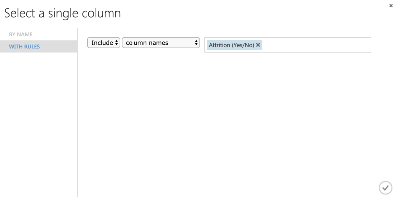 Hier kiezen we de kolom 'Attrition Yes/No' (door te zoeken in het veld 'Column Names') en vervolgens klik je op het Vinkje om dit te bevestigen.