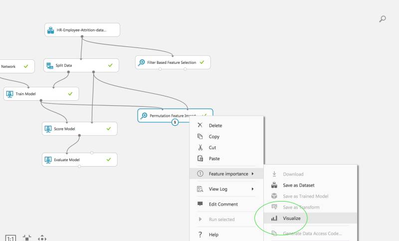 Je kunt wel de blokjes 'Score Model' en 'Evaluate Model' verkennen, en de uitkomsten visualiseren door op een blokje met de rechtermuisknop het menu op te roepen